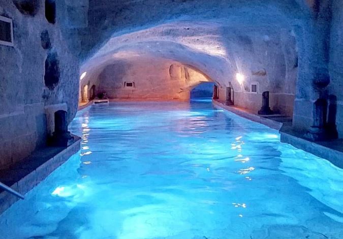 Hotel e Thermae nei Sassi di Matera con camere in grotta e piscina ricavata all'interno di antiche cisterne in un luogo senza tempo.